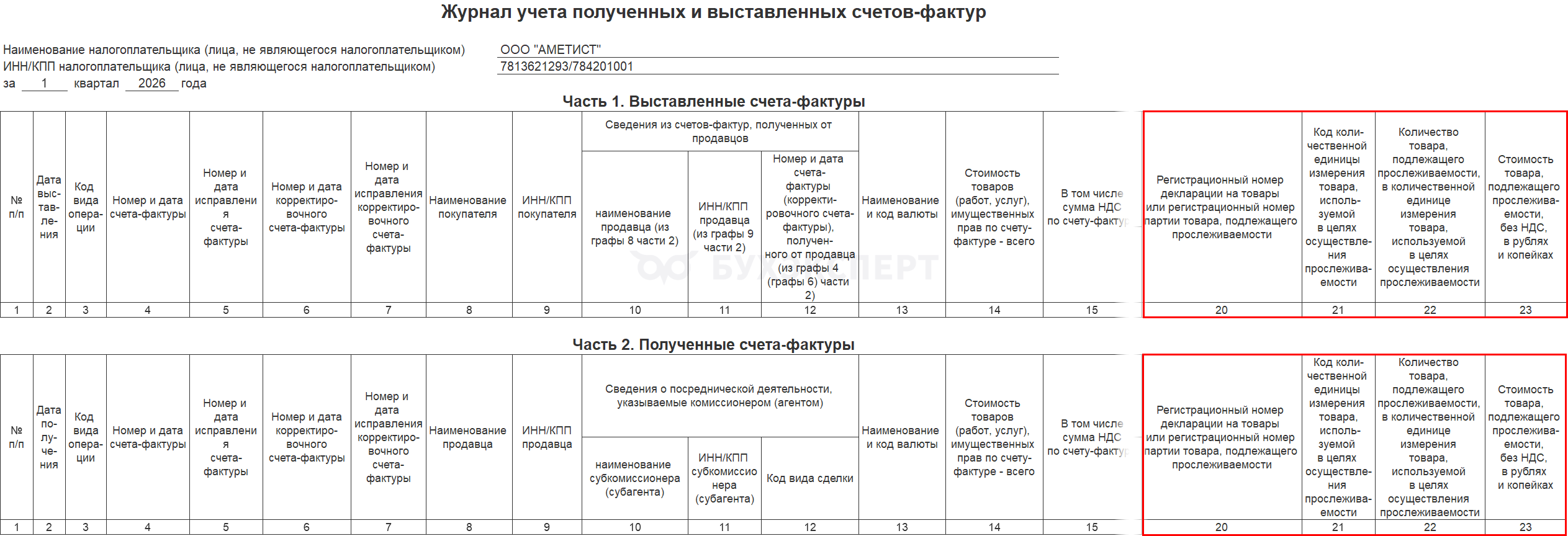 Форма: Журнал учета полученных и выставленных счетов-фактур за 1 квартал заполняется по обновленной форме, утвержденной Постановлением Правительства от 26.12.2011 N 1137 (в ред. Постановления Правительства от 23.01.2026 N 26).