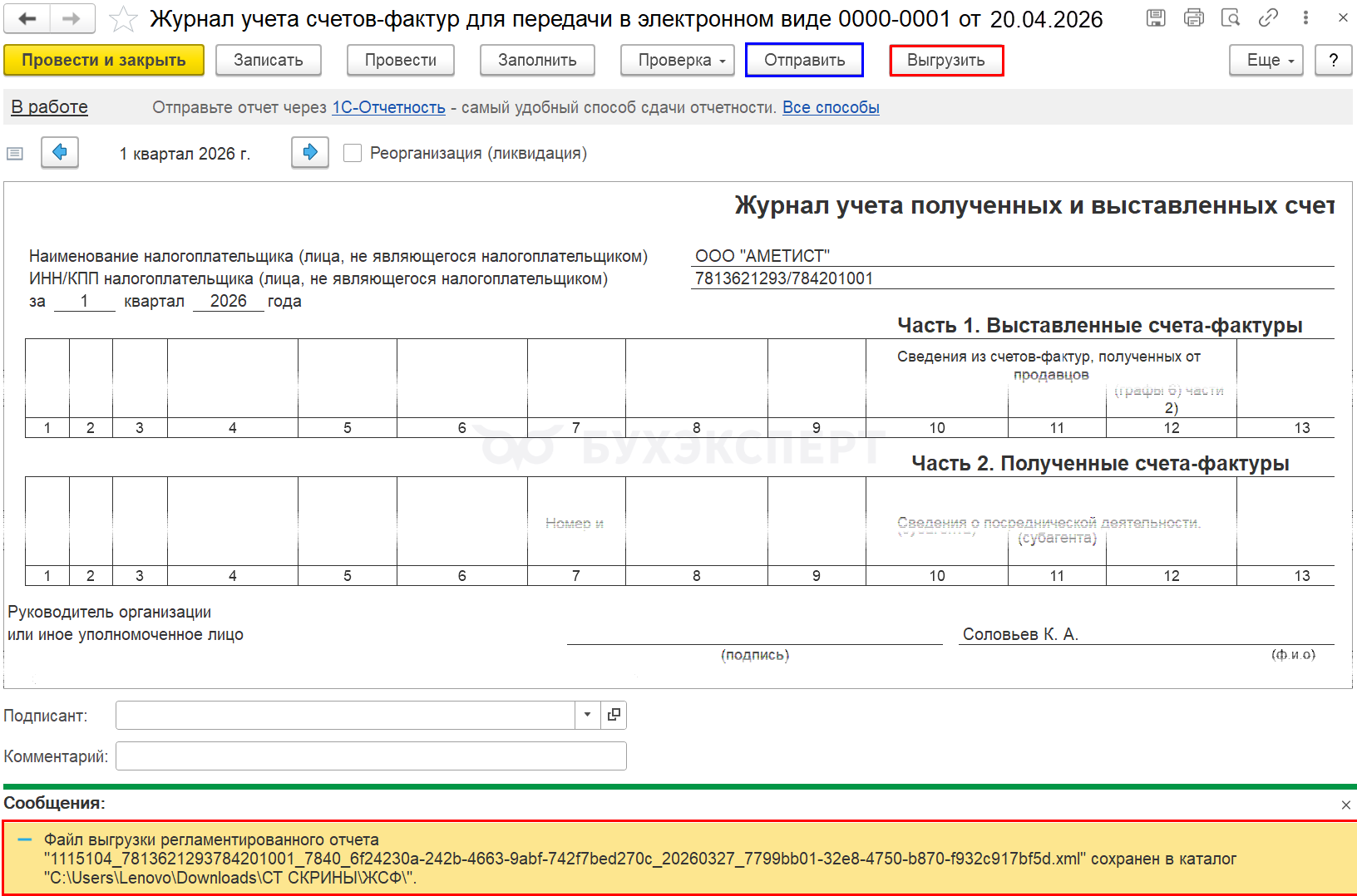 Мы рассмотрели, как в 1С 8.3 Бухгалтерия заполнить Журнал учета полученных и выставленных счетов-фактур за 1 квартал 2026, как проверить в 1С правильность журнала учета счетов-фактур, как выгрузить из 1С журнал счетов-фактур.