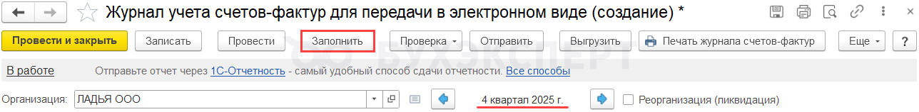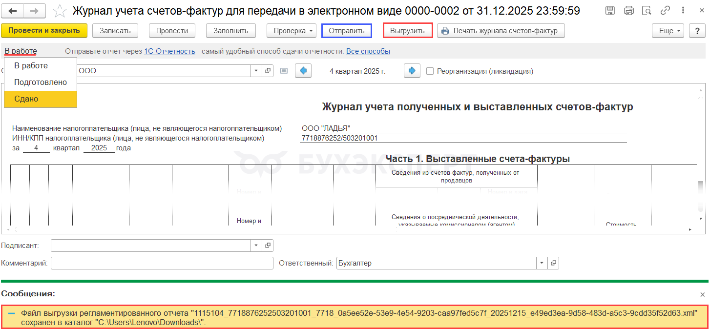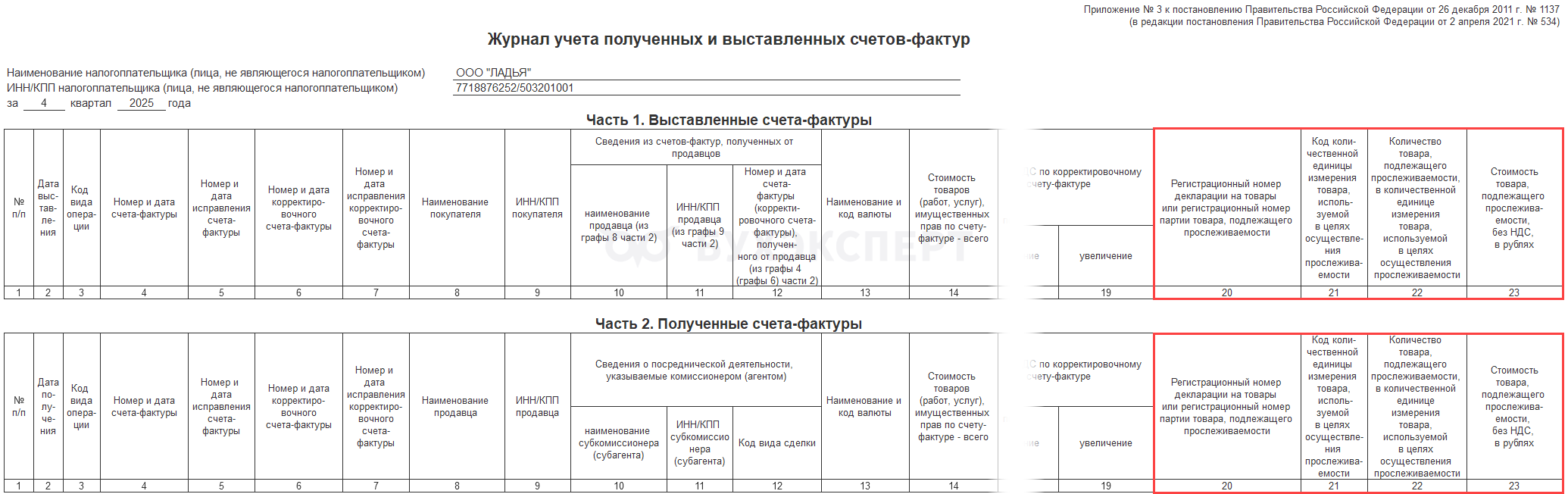 Журнал учета полученных и выставленных счетов-фактур за 4 квартал 2025 в 1С (20.01.26)