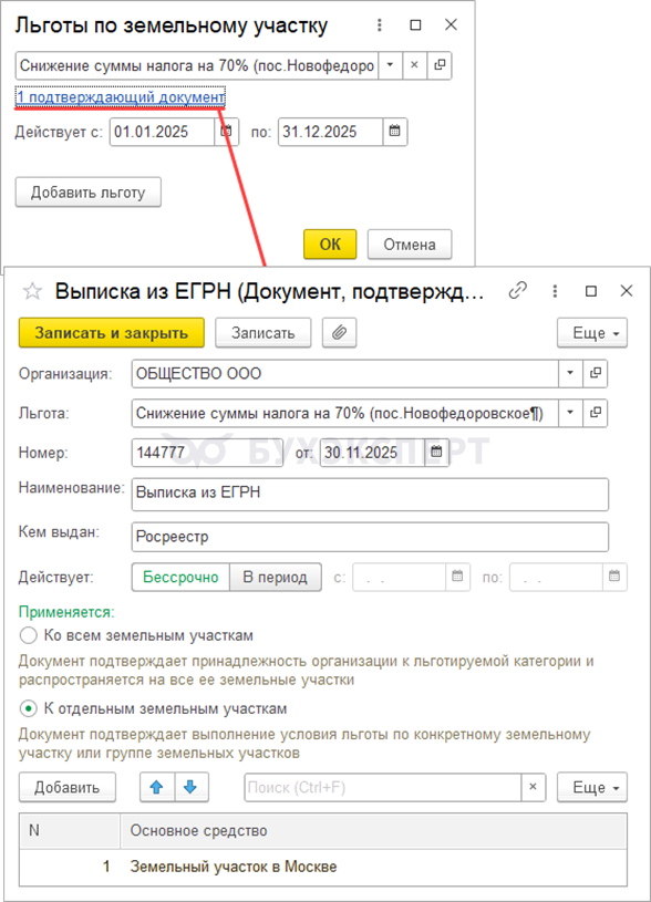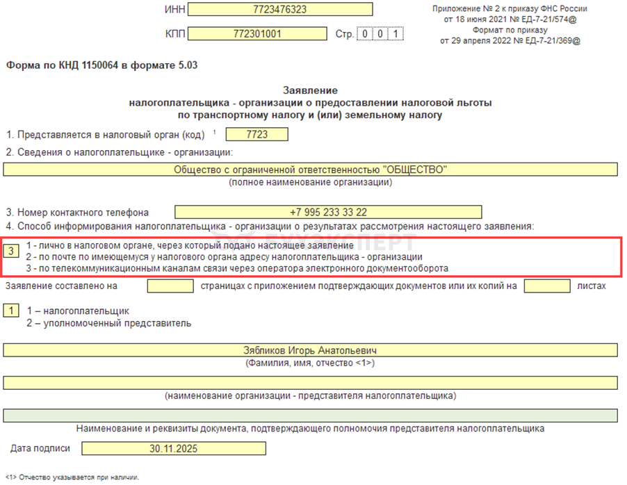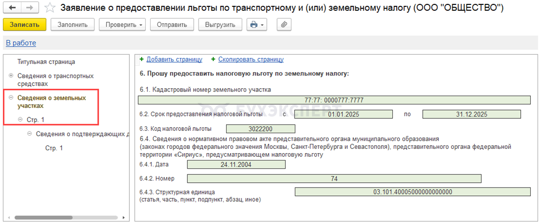 Заявления на льготы по транспорту и земле 2026 в 1С — образец