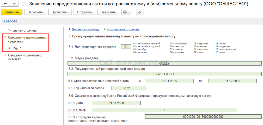 Мы заполнили Заявление о предоставлении льготы по транспортному и земельному налогу в 1С:Бухгалтерия 8.