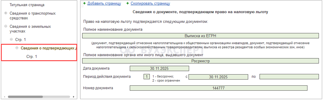 Если не прилагаете к заявлению на льготу подтверждающие документы, заполните раздел Сведения о документе, подтверждающем право на налоговую льготу. Он заполнится автоматически, если при отражении льготы в карточке регистрации земельного участка указан подтверждающий документ.