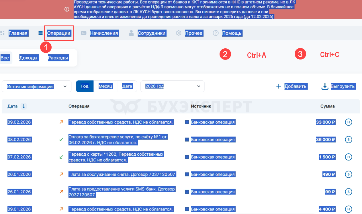 Шаг 2. В своем ЛК АУСН на сайте ФНС перейдите в раздел Операции и выделите содержимое (Ctrl+A), затем скопируйте (Ctrl+C).