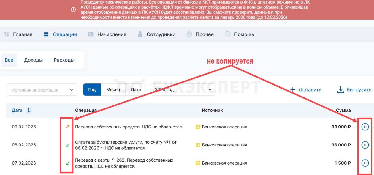Информация о типе операции (приход, расход) и разметке базы не копируется из ЛК ЕНС.