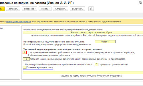 Спасибо, за ответ! Правда я не ожидала этого ответа! Но вы меня не поняли. Все как раз наоборот. Галочку не ставлю. А ставлю 6% в заявлении на Патент. Проверяю-смотрю в печатной форме, а там ничего не стоит не 6% не 0? И это уже не первый год так. И приходится уже в заявлении править на листе 2, ставить 6%, там где оно уже в работе. И не понятно, ведь 6% ставила, и почему нет %. Я и Говорю у вас в примере в Бухэксперт также, ставите 6 а в образце в печатной форме ноль стоит. Вот еще и написано, что заявление изготовлено в помощнике заполнения, при редактировании заявления, дальнейшая работа в помощнике невозможна. А как не редактировать, ведь мне надо 6%?