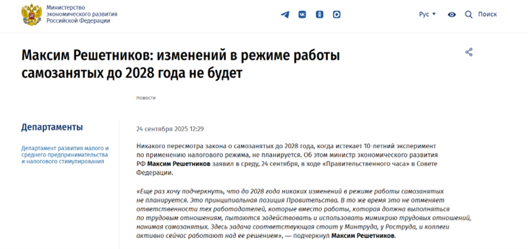 А еще две недели назад озвучивалось, что изменений в режиме работы самозанятых до 2028 года не будет. Об этом сообщал министр экономического развития Максим Решетников 24 сентября в ходе «Правительственного часа» в Совете Федерации: