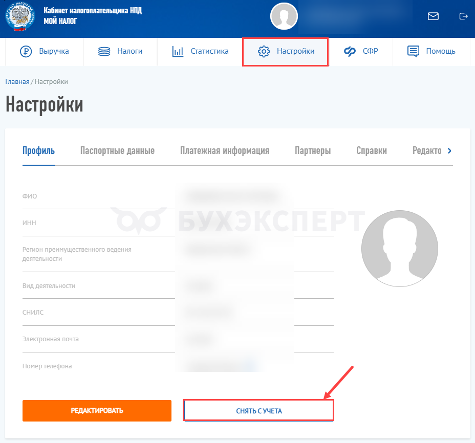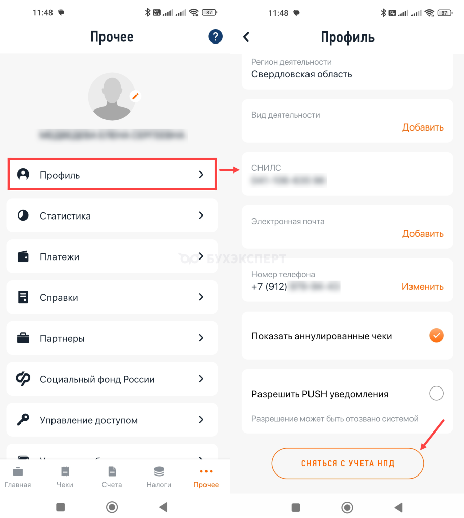 Чтобы самозанятому сняться с учета через мобильную версию кабинета, перейдите в Прочее — Профиль — Сняться с учета НПД.