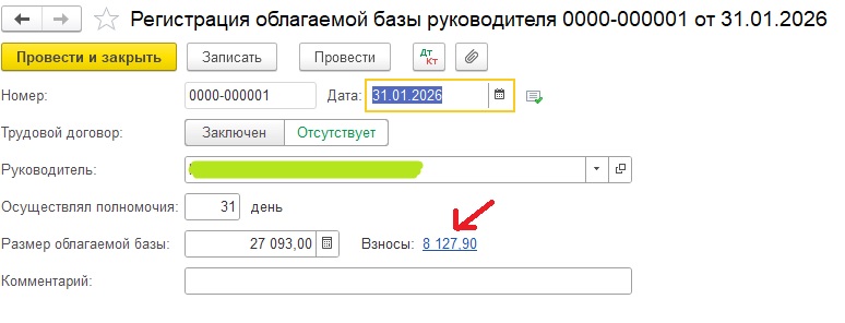 Шаг 1. Создайте документ Регистрация облагаемой базы руководителя.