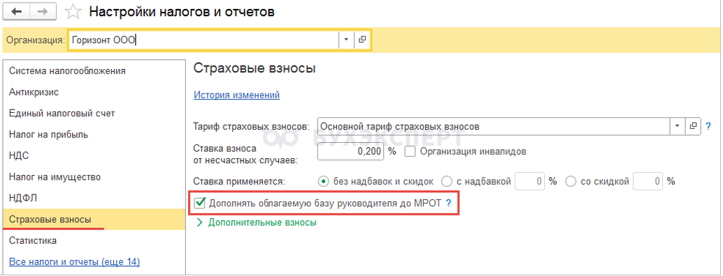- Флажок Дополнить облагаемую базу руководителя до МРОТ
