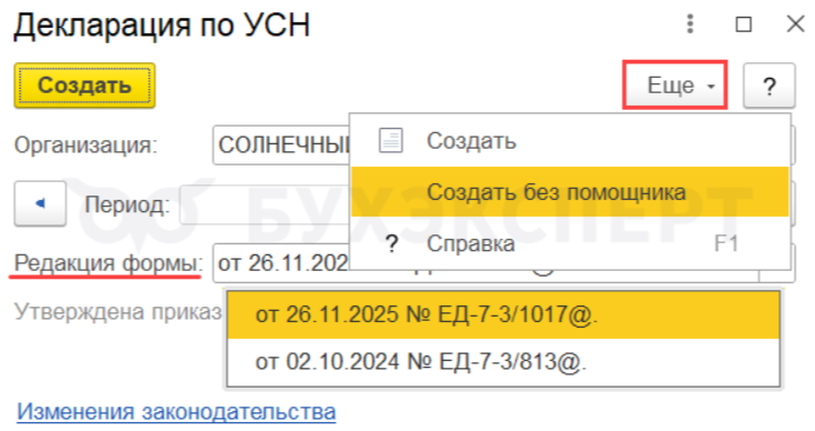 В 1С:Бухгалтерия сформировать декларацию можно в разделе Отчеты — 1С-Отчетность без использования Помощника по УСН, а также выбрать форму. ФНС рекомендует отчитаться по новой форме.