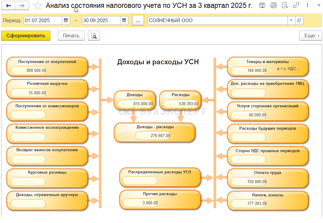 По ним можно сформировать Универсальный отчет в разделе Отчеты. Например, по доходам с настройками, аналогичными отчету по расходам — Отчет по проверке расходов УСН, как в 1С:Бухгалтерия 2.0