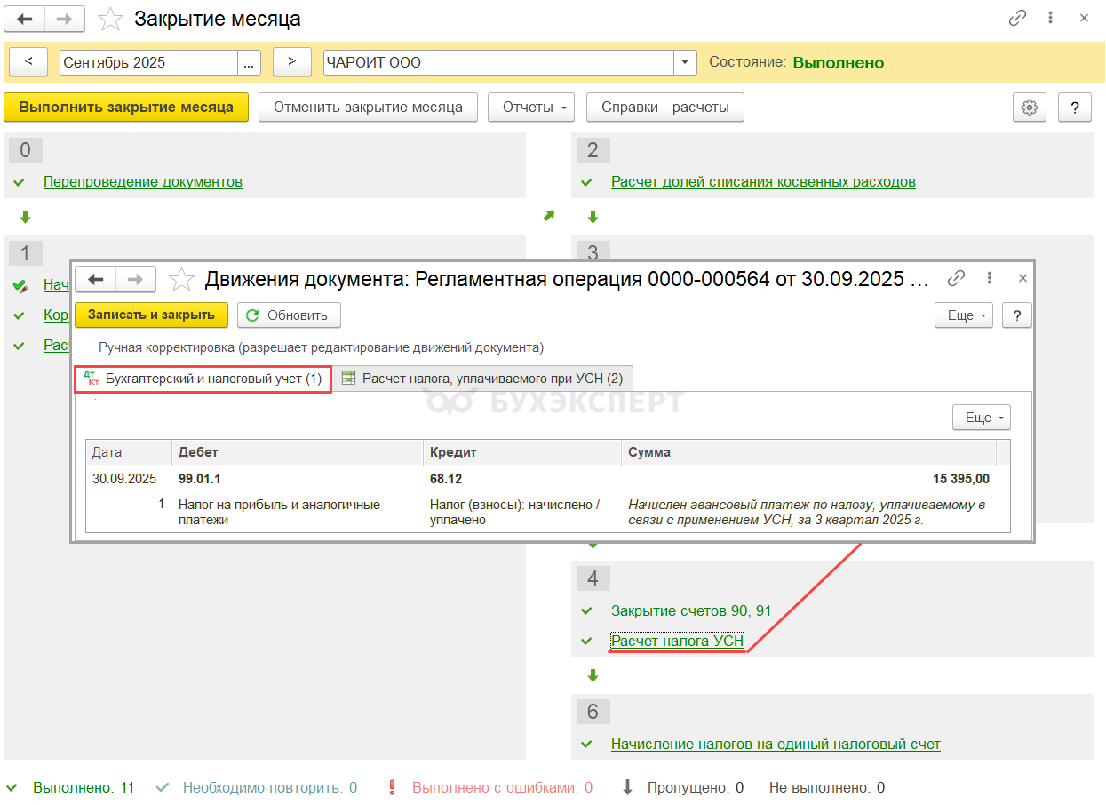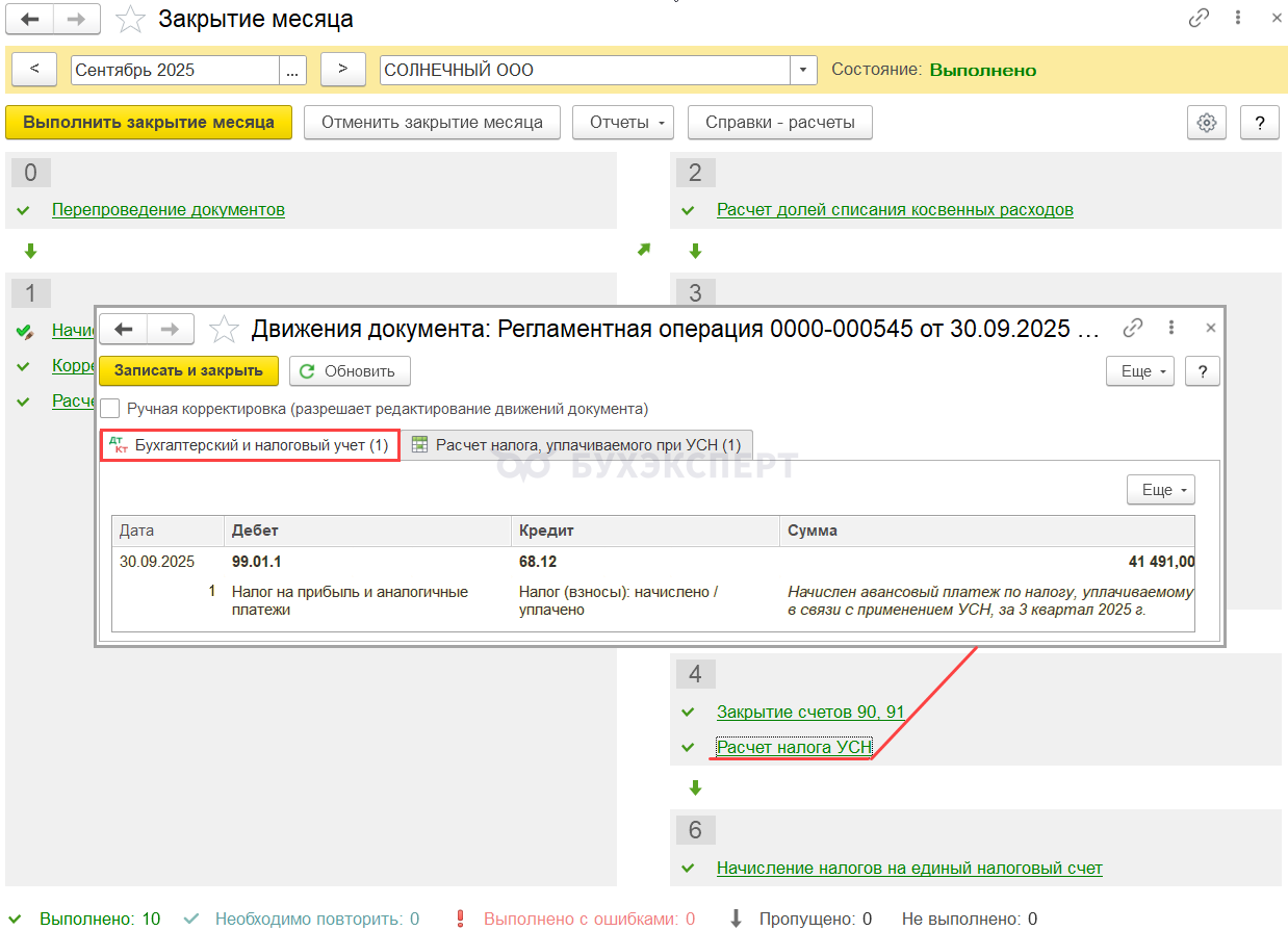 В разделе Операции — Закрытие месяца — Расчет налога УСН — за сентябрь 2025: