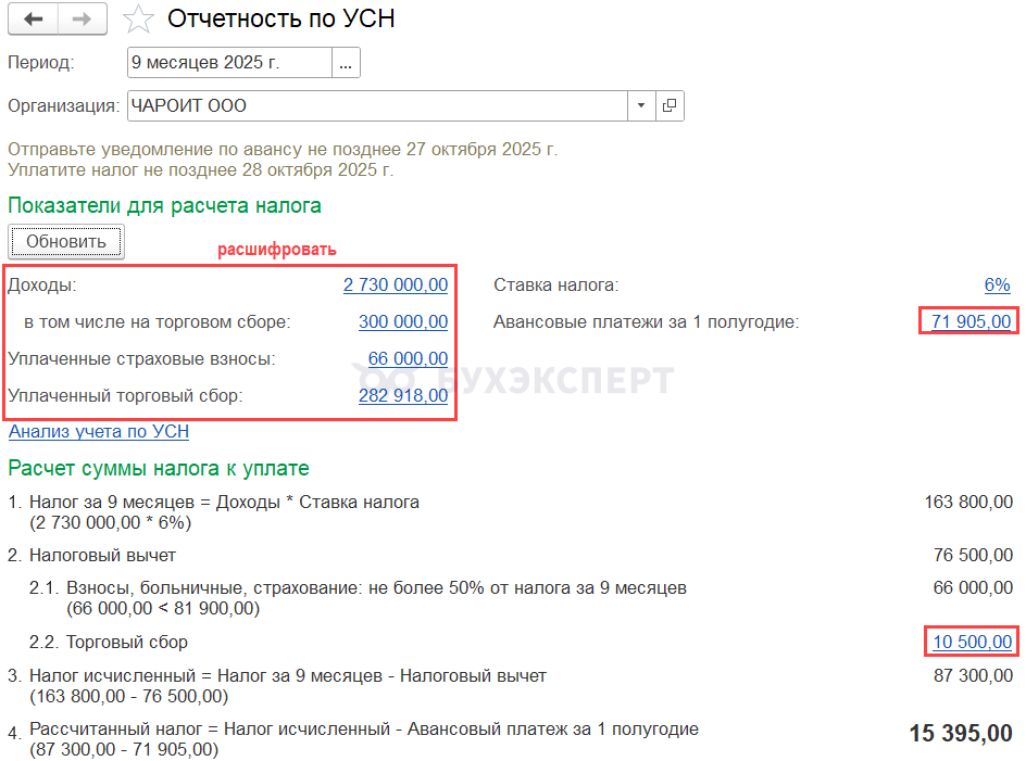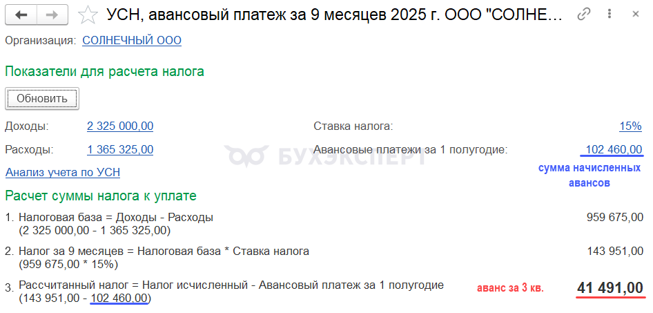 В статье разберем алгоритм расчета авансовых платежей по налогу на УСН «доходы-расходы» 15% и «доходы» 6% за 9 месяцев 2025 года в программе 1С Бухгалтерия: 8.3:
