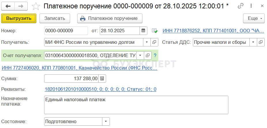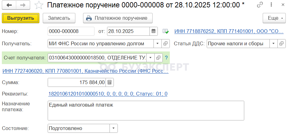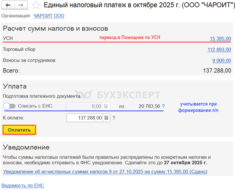 Сформируйте автоматически платежное поручение на уплату ЕНП по кнопке Оплатить. Его можно сразу выгрузить в банк.