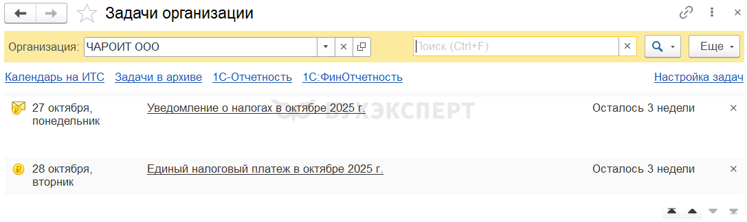 Рассчитать и уплатить авансы, а также отправить уведомление по УСН можно из раздела Главное – Задачи организации (или Отчеты — Календарь отчетности).