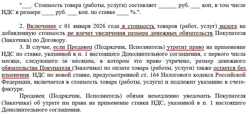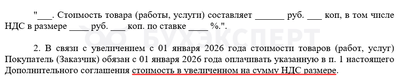 Например, цена увеличивается на сумму: Скачать образец дополнительного соглашения к договору НДС с 01.01.2026 (базовое)