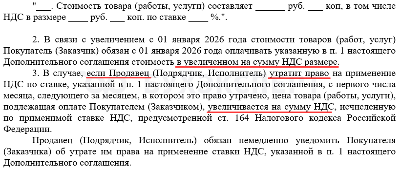 - если цена увеличивается на сумму НДС Скачать образец дополнительного соглашения к договору НДС с 01.01.2026 (смена ставки)