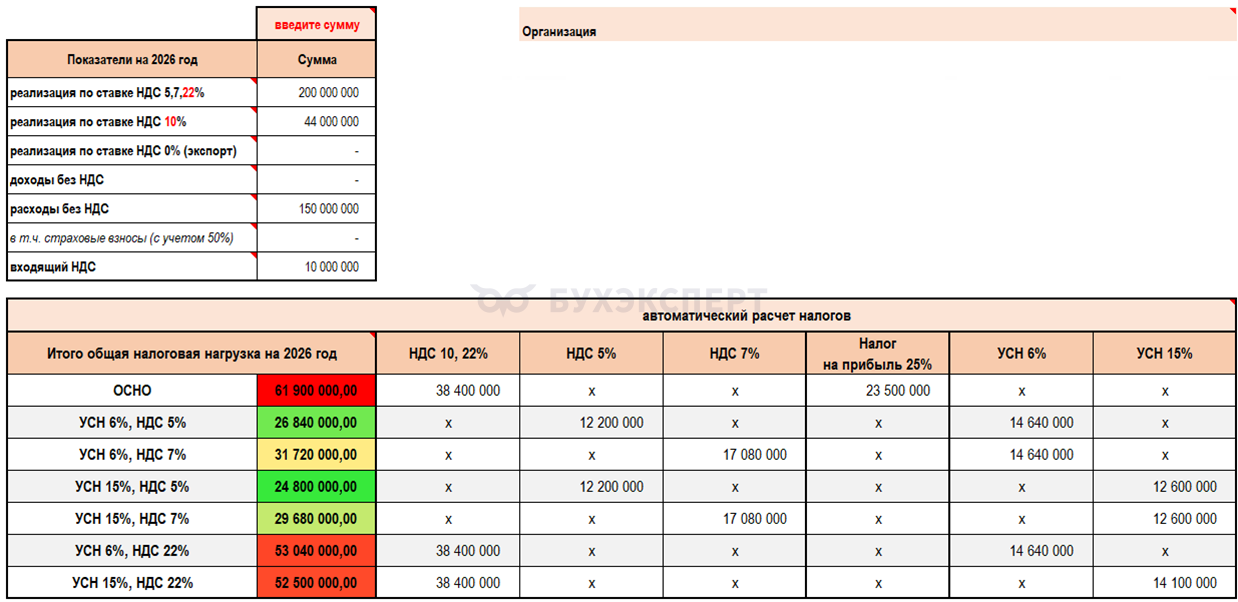 Для расчета налоговой нагрузки в зависимости от налогового режима и ставки НДС можно использовать: