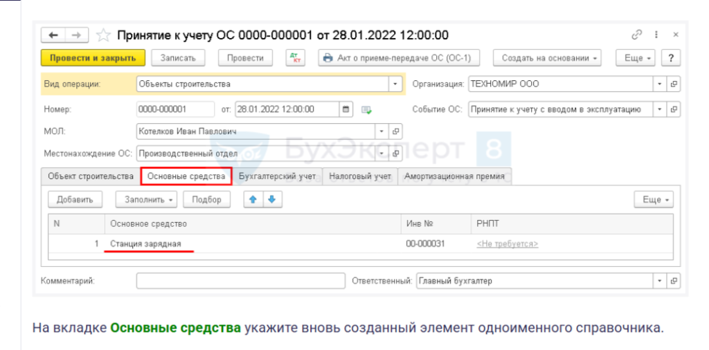 На вкладке Основные средства укажите вновь созданный элемент одноименного справочника.