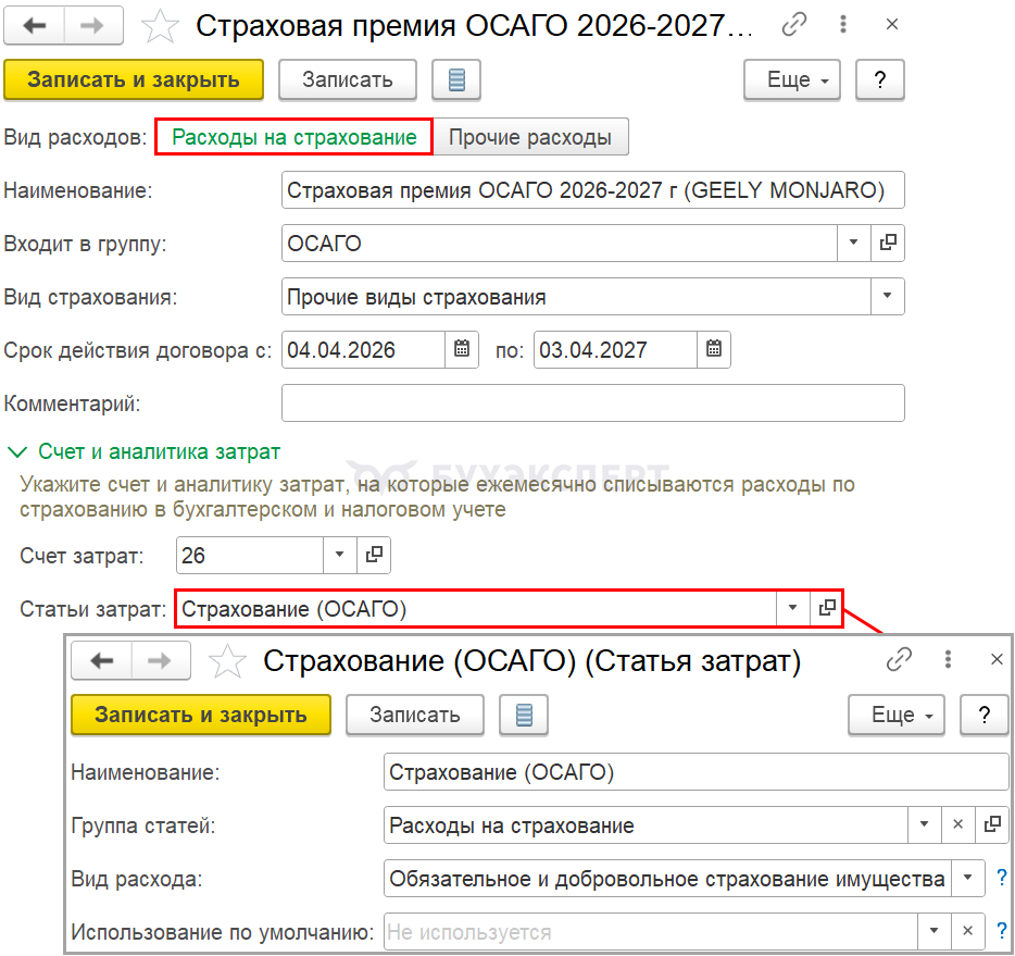 - Расходы будущих периодов — параметры для автоматического равномерного признания затрат на ОСАГО