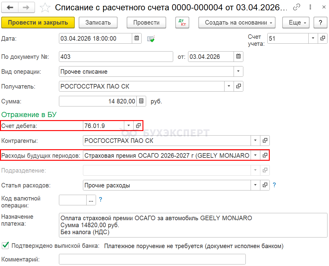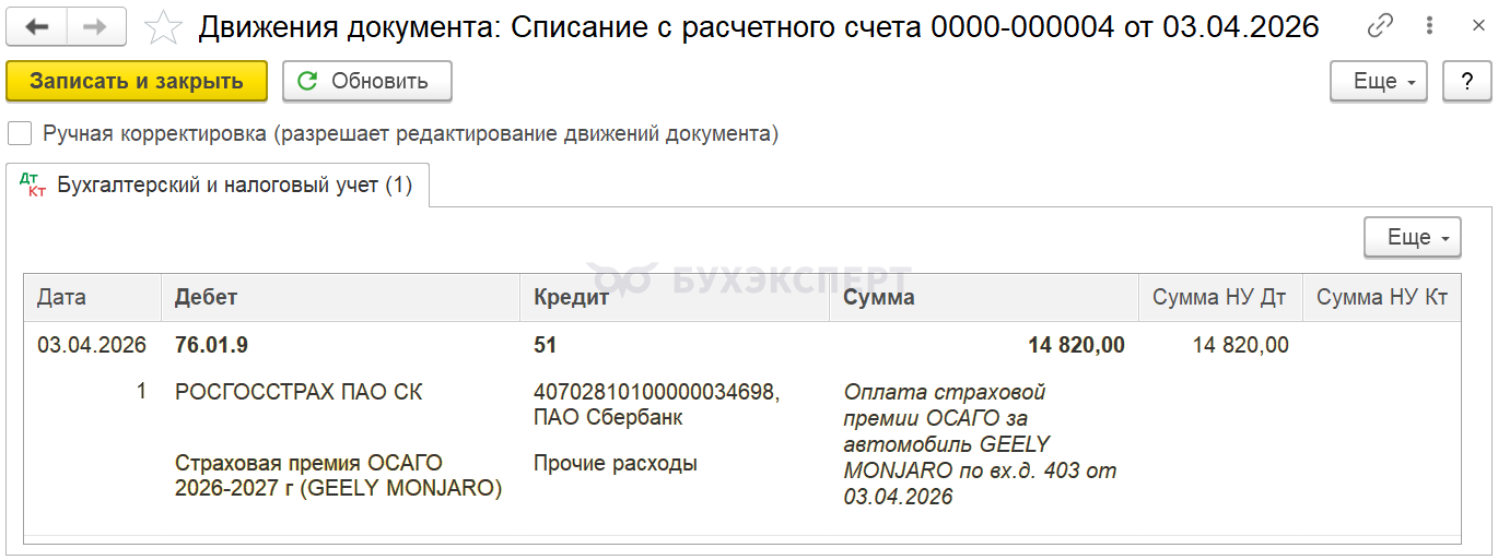| 03 апреля | 76.01.9 | 51 | 14 820 | 14 820 | Оплата страховой премии ОСАГО | Списание с расчетного счета — Прочее списание |