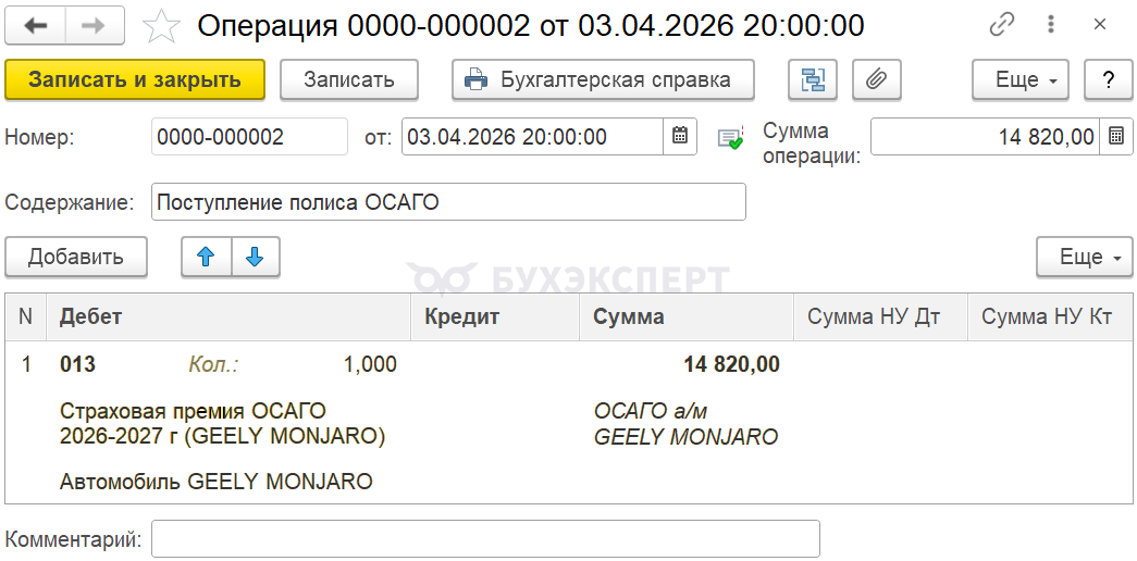 | 013 | 14 820 | Учет страхового полиса ОСАГО | Операция, введенная вручную — Операция |