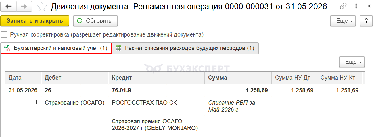 | 31 мая | 26 | 76.01.9 | 1 258,69 | 1 258,69 | 1 258,69 | Учет затрат на ОСАГО | Закрытие месяца — Списание расходов будущих периодов |