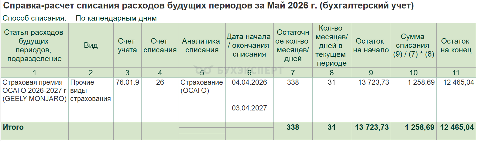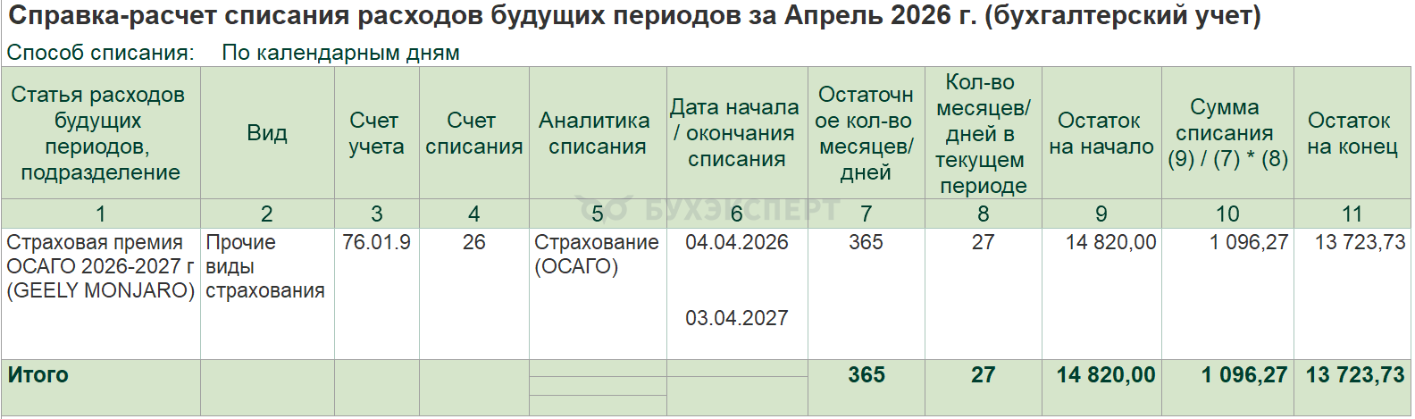 | 30 апреля | 26 | 76.01.9 | 1 096,27 | 1 096,27 | 1 096,27 | Учет затрат на ОСАГО | Закрытие месяца — Списание расходов будущих периодов |