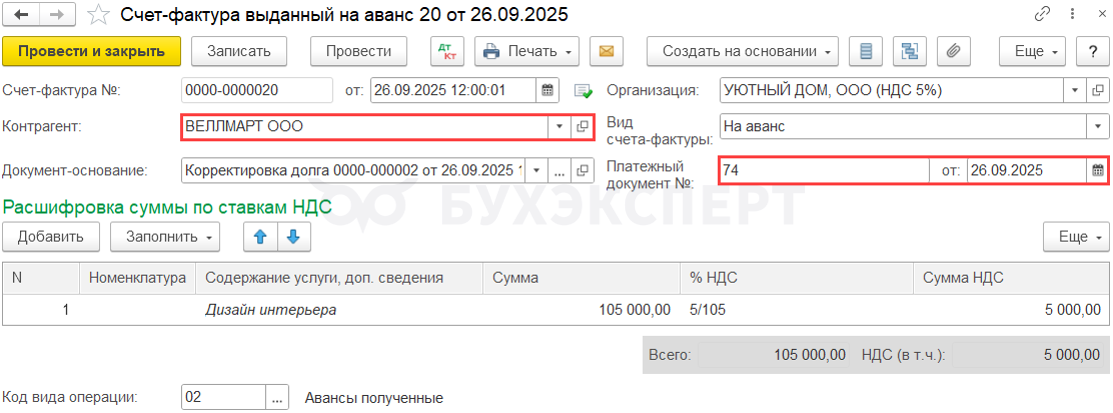Создайте Счет-фактуру выданный вид операции На аванс на основании документа Корректировка долга по кнопке Создать на основании.