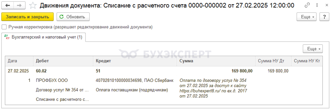27 февраля перечислена оплата за доступ к сайту Бухэксперт на 1 год — 169 800 руб. без НДС.