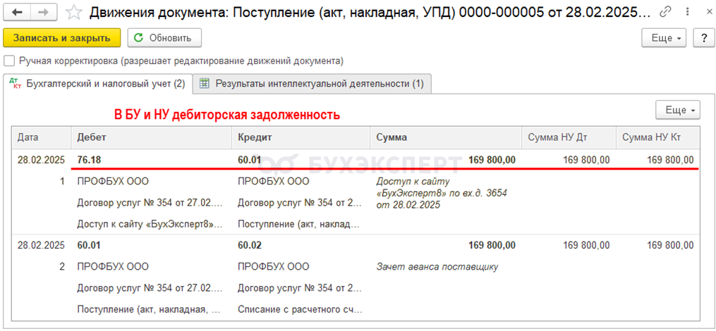 - Дт 76.18 Кт 60.01 — принятие к учету неисключительного права в виде дебиторской задолженности для дальнейшего равномерного ежемесячного признания в расходах