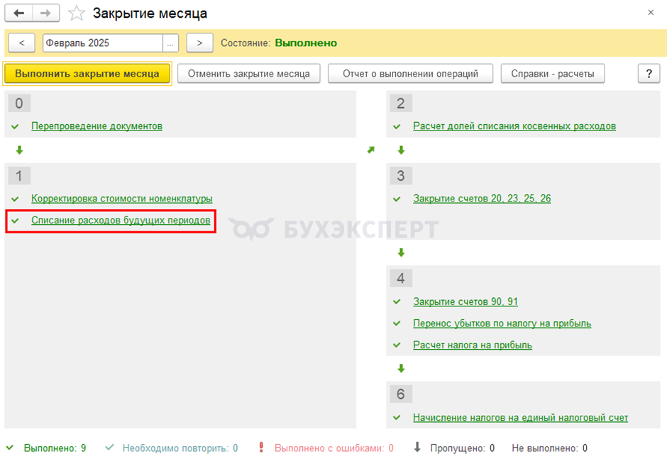 Для автоматического ежемесячного учета затрат на ПО запустите процедуру Закрытие месяца регламентная операция Списание расходов будущих периодов в разделе Операции — Закрытие месяца.