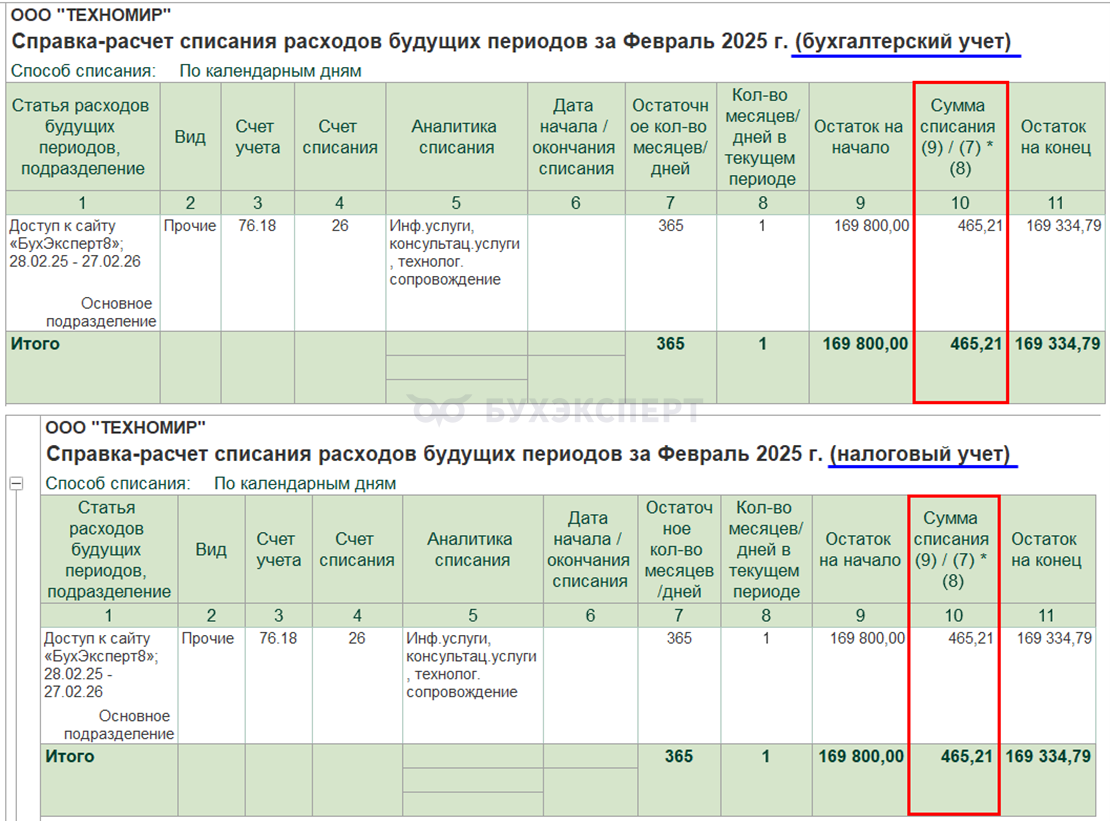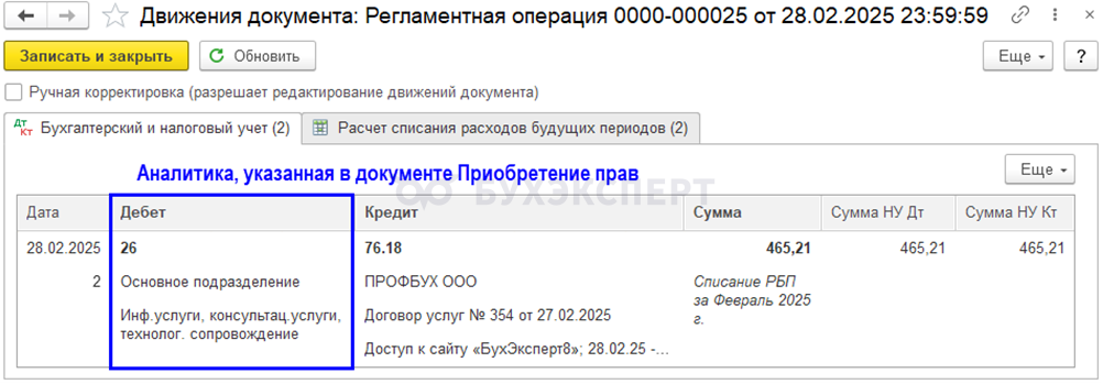| 28 февраля | 26 | 76.18 | 465,21 | 465,21 | 465,21 | Ежемесячный учет затрат на неисключительное право | Закрытие месяца — Списание расходов будущих периодов |