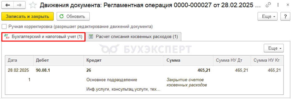 | 28 февраля | 90.08.1 | 26 | 465,21 | 465,21 | 465,21 | Признание затрат на неисключительное право в составе управленческих (косвенных) расходов | Закрытие месяца — Закрытие счетов 20, 23, 25, 26 |