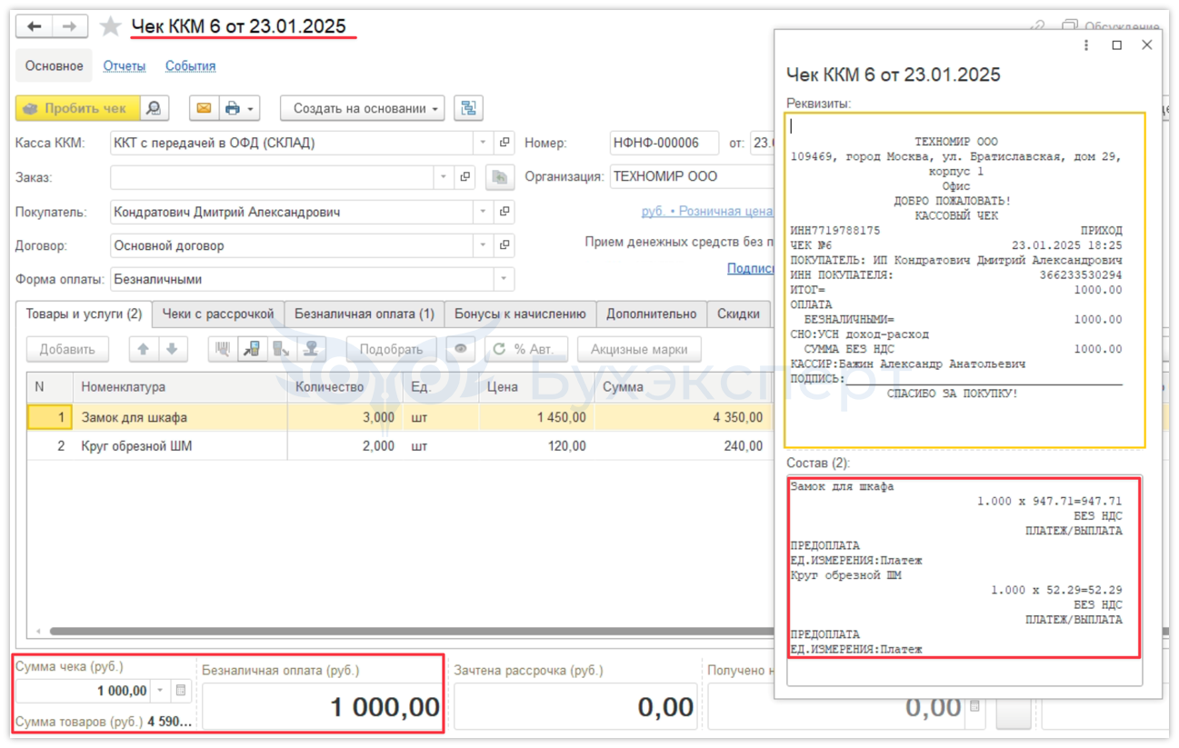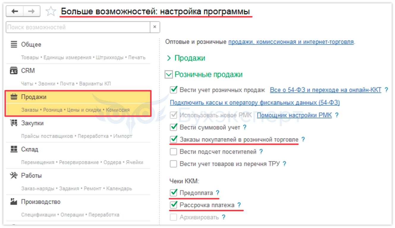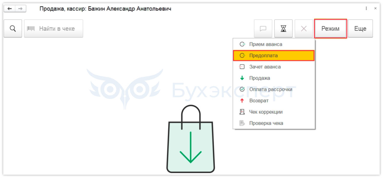 Продажи – розничные продажи – Рабочее место кассира (РМК) – Режим – Предоплата