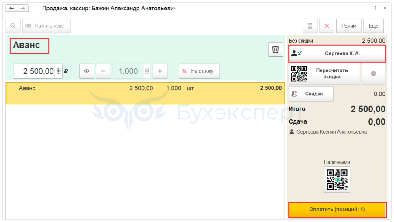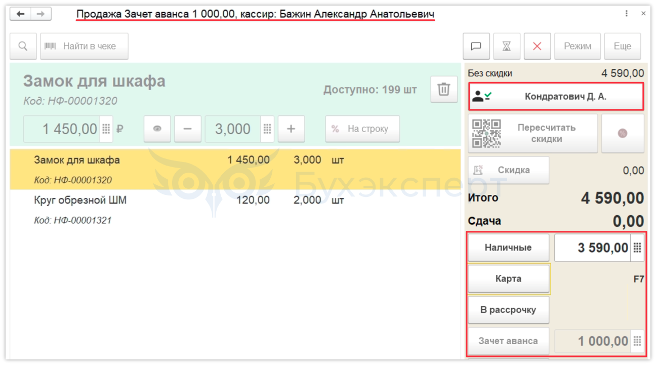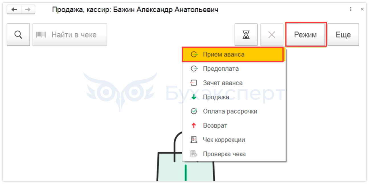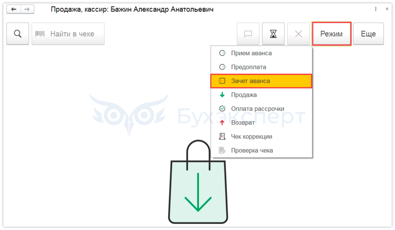 Продажи – розничные продажи – Рабочее место кассира (РМК) – Режим – Зачет аванса