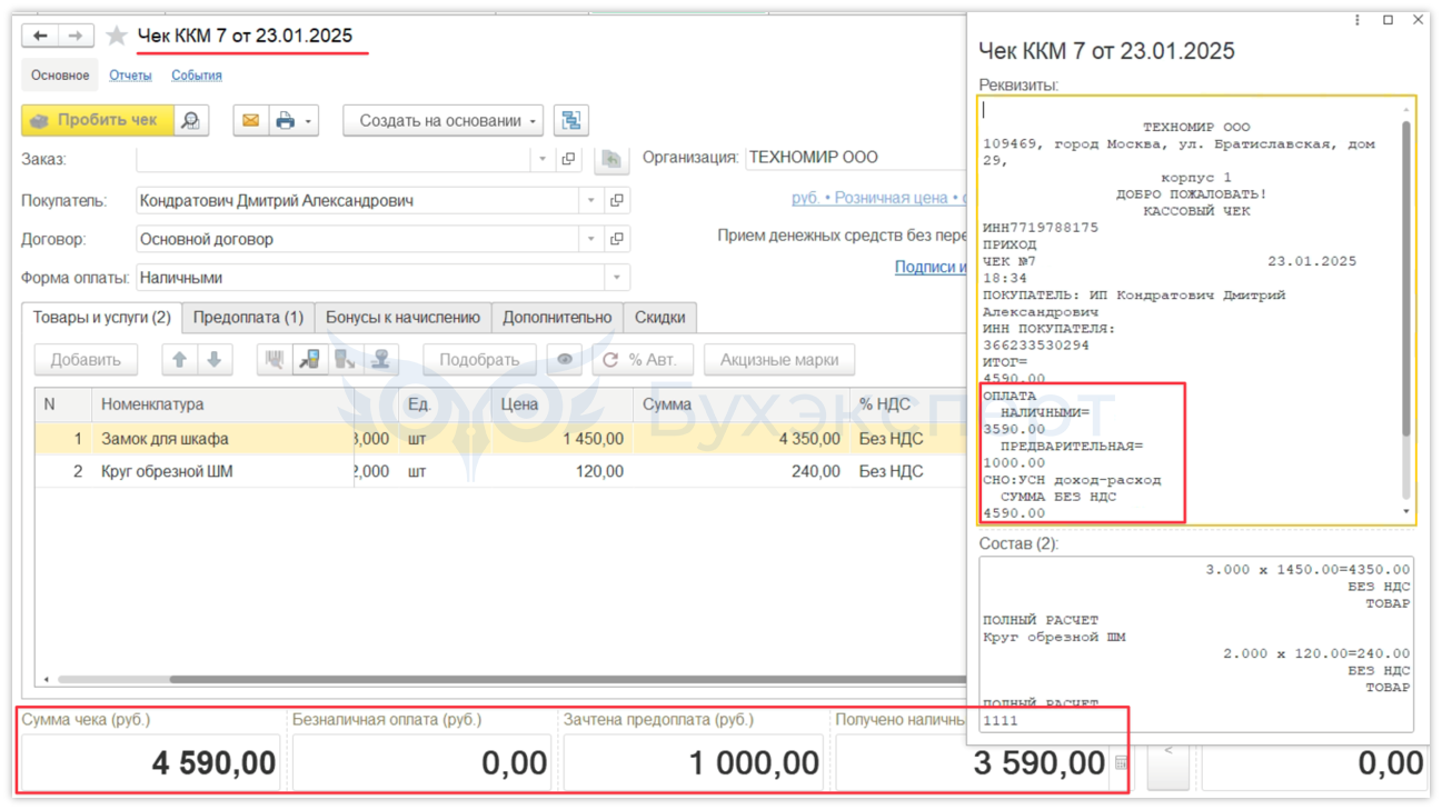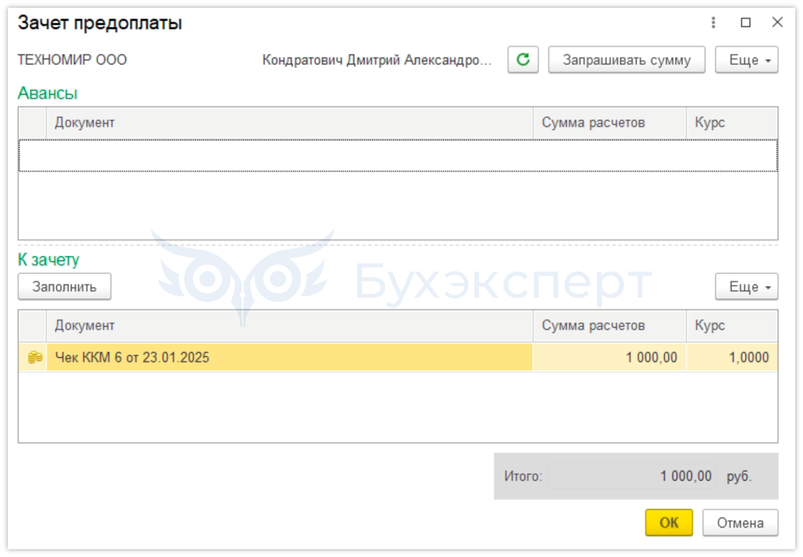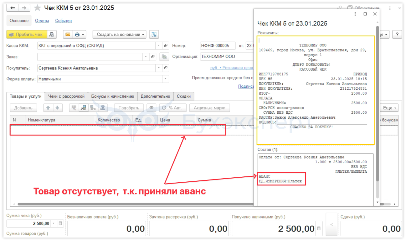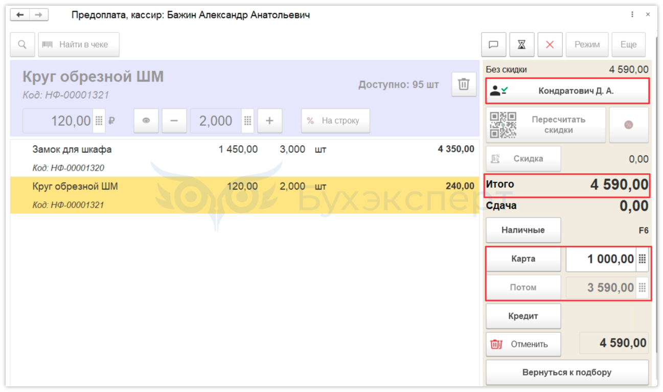 Продажи – розничные продажи – Рабочее место кассира (РМК) – Режим – Зачет аванса