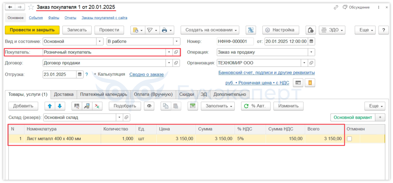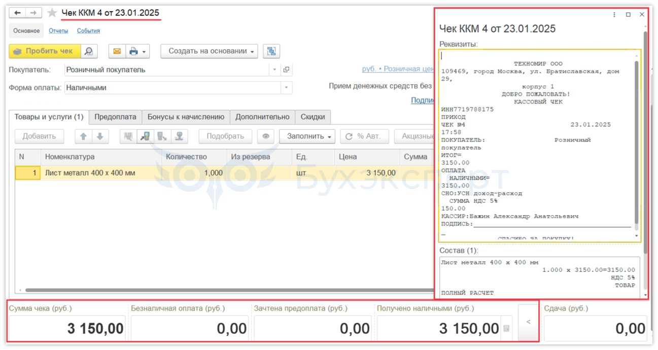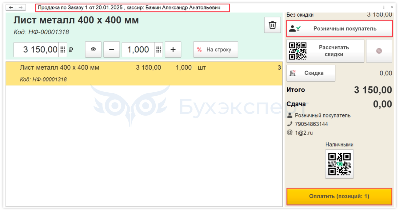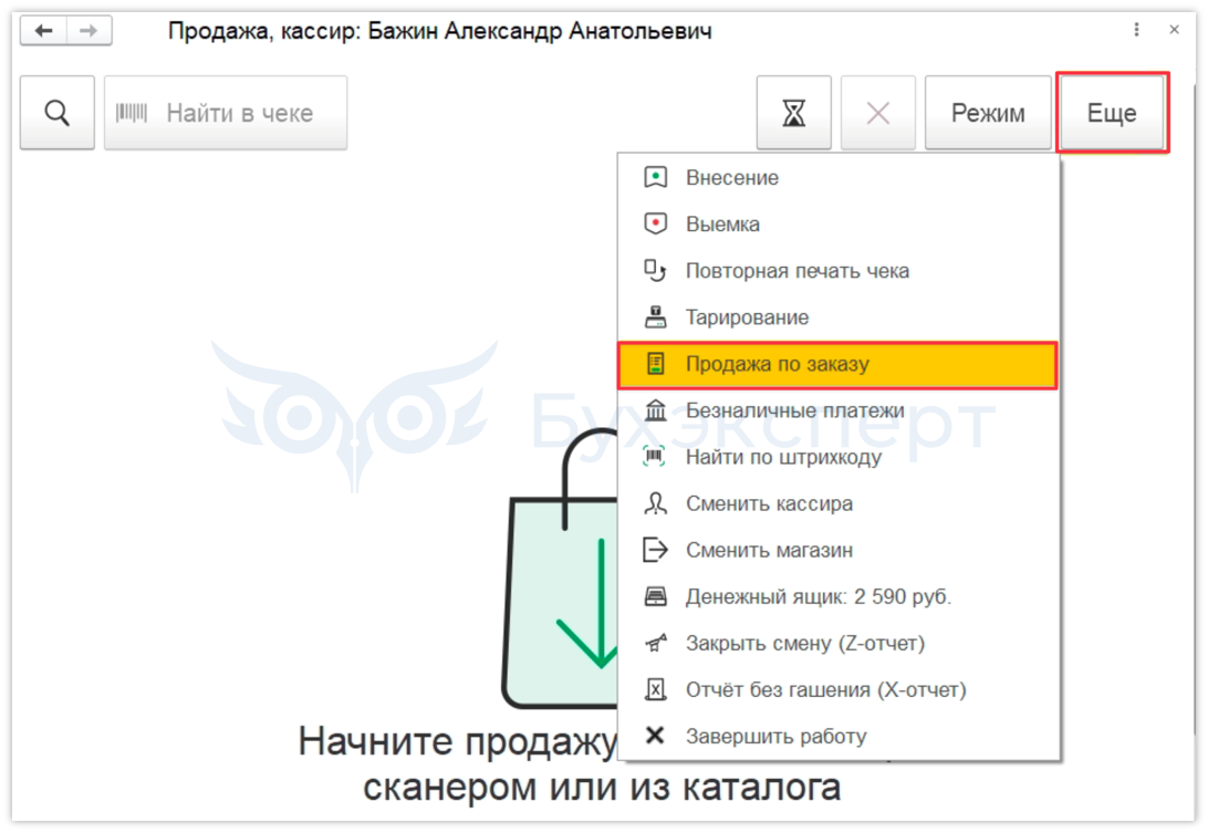 Продажи – розничные продажи – Рабочее место кассира (РМК) – Еще – Продажа по заказу