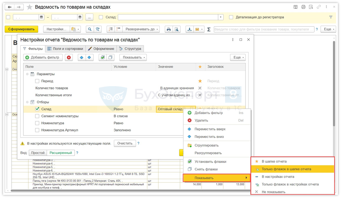 Отбор Склад скройте из шапки отчета. Нажмите правой копкой мыши, установив курсор на строке Склад в контекстном меню выберите – Не показывать.