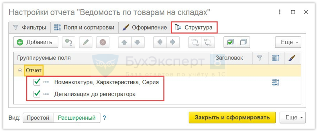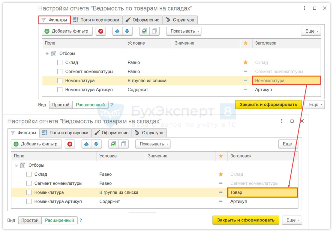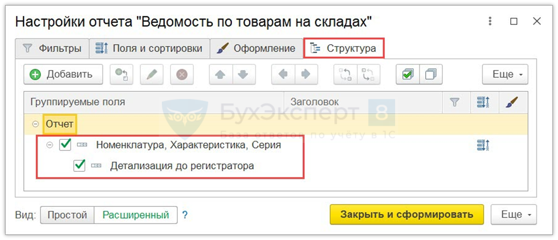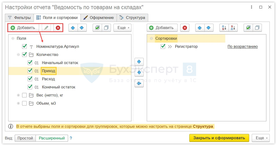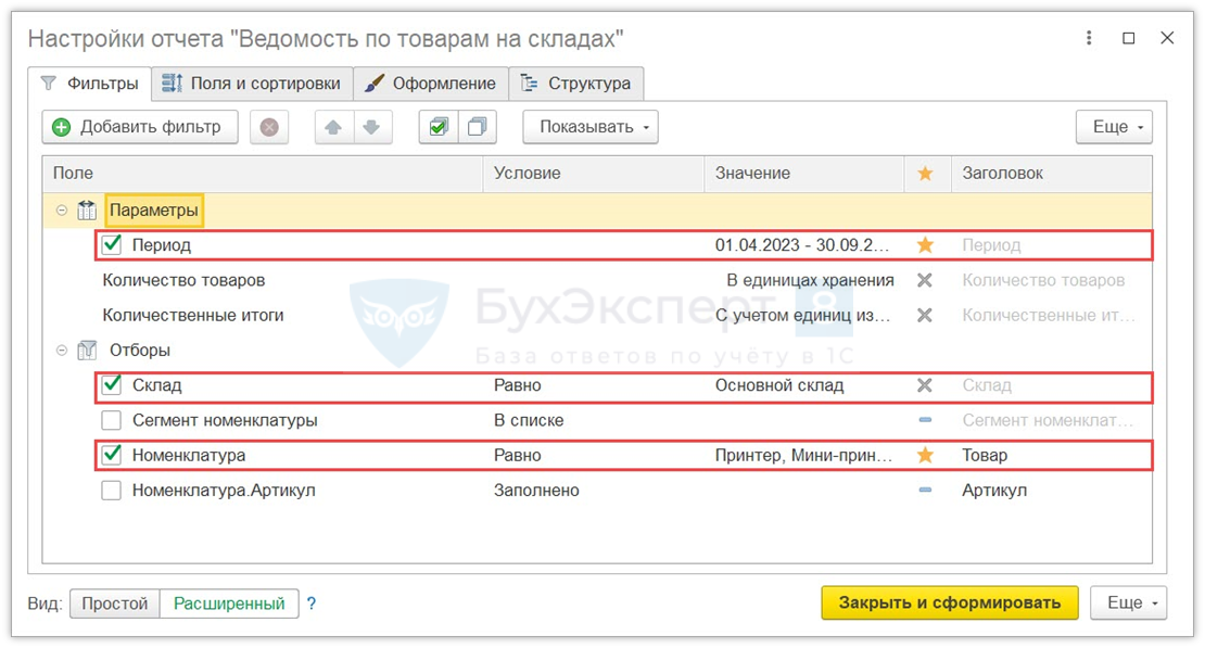 Дополнительно добавить отборы можно при помощи Настройки. Если установлен тумблер Вида настройки – Простой, можно задать отбор по: