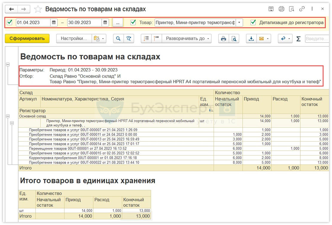 Рассмотрим отчет с отбором по номенклатуре за период второго и третьего квартала, с указанием документов-движения товаров. Бухгалтер работает только с одним складом — отбор в шапке отчета не нужен.