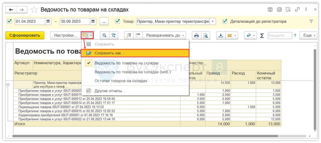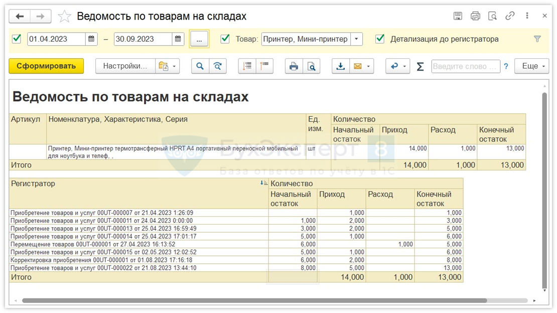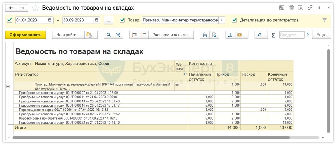 Для получения информации о документах поступления, списания и реализации товаров, установите флажок Детализация до регистратора.