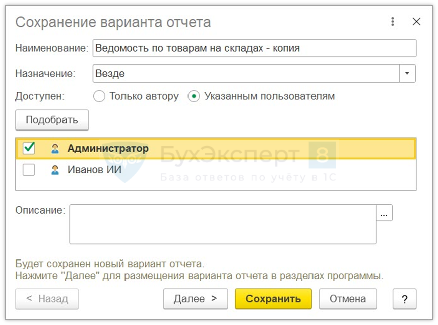 Задать произвольное наименование, указать пользователей, для которых будет доступен этот отчет, и описание отчета.
