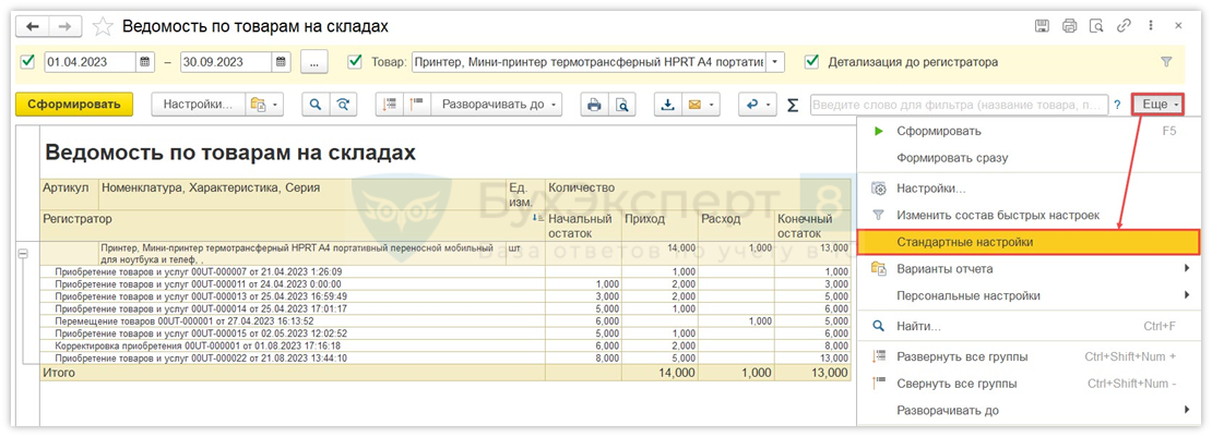 Для сброса настроек до стандартного отчета нажмите кнопку Еще – Стандартные настройки.