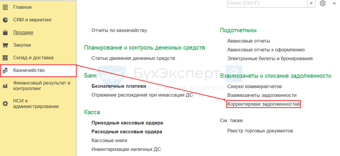 Для начала работы с документом перейдите в меню Казначейство — Корректировки задолженностей.