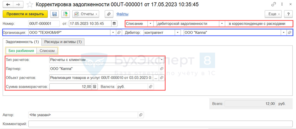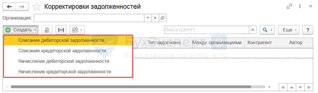 Перейдите в раздел Казначейство — Корректировки задолженностей, нажмите кнопку Создать — Списание дебиторской задолженности. Укажите Организацию и Контрагента. На вкладке Задолженность заполните все поля: Тип расчетов, Партнер, Объект расчетов и Сумма.