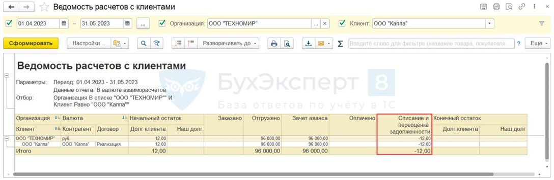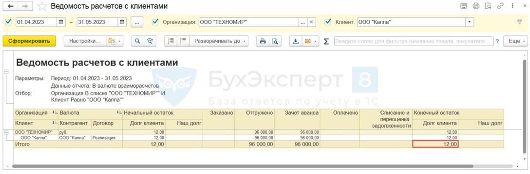 После проведения документа Корректировка задолженности проверьте состояние расчетов в отчете Ведомость расчетов с клиентами.
