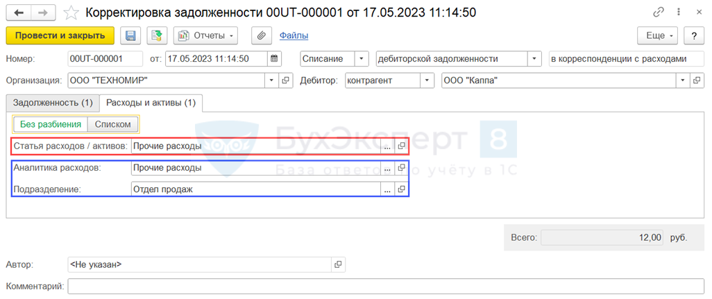 На вкладке Расходы и активы выберите Статью расходов. Аналитика расходов и Подразделение указываются в соответствии с настройкой Статьи расходов.