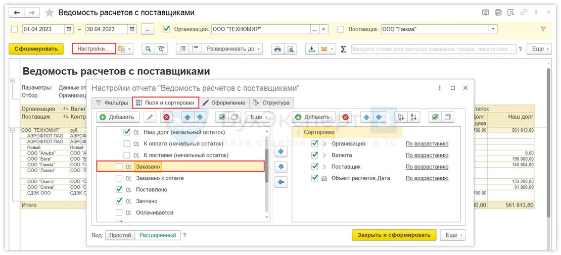 Колонка Заказано отражает информацию о суммах заказанных, но неотгруженных товаров (неоказанных услуг). Чтобы исключить эту колонку из отчета, нажмите кнопку Настройки, на вкладке Поля и сортировки снимите флажок Заказано.