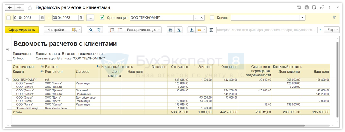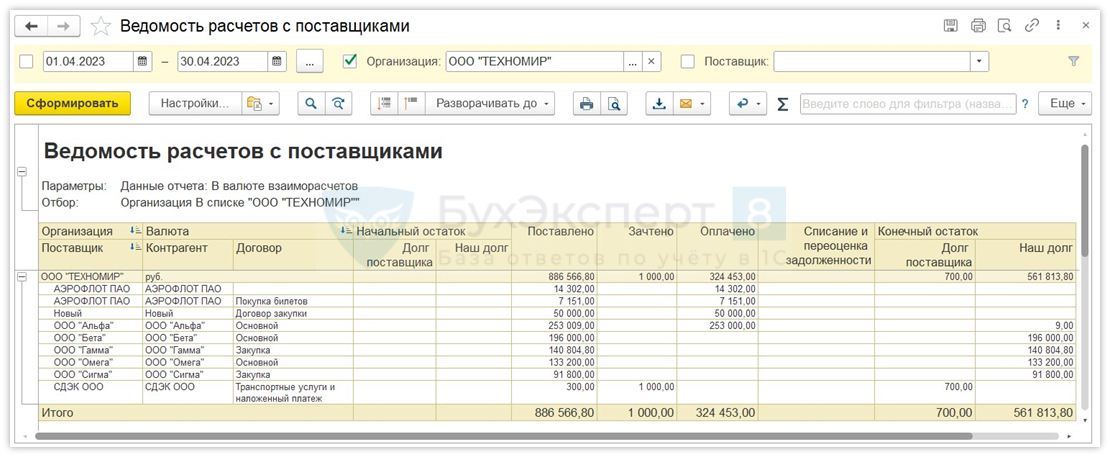 Отчет имеет идентичные структуру и набор стандартных настроек с отчетом Ведомость расчетов с поставщиками.
